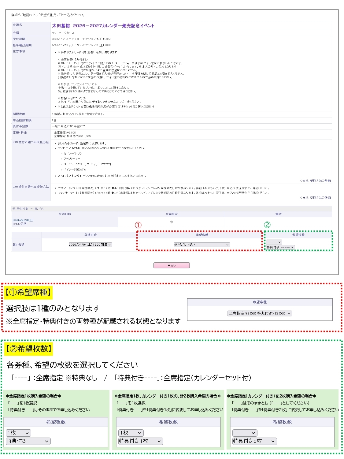 ①画面の「希望席種」部分には「全席指定(特典なし)」と「全席指定・特典付き」の両券種が記載されます。