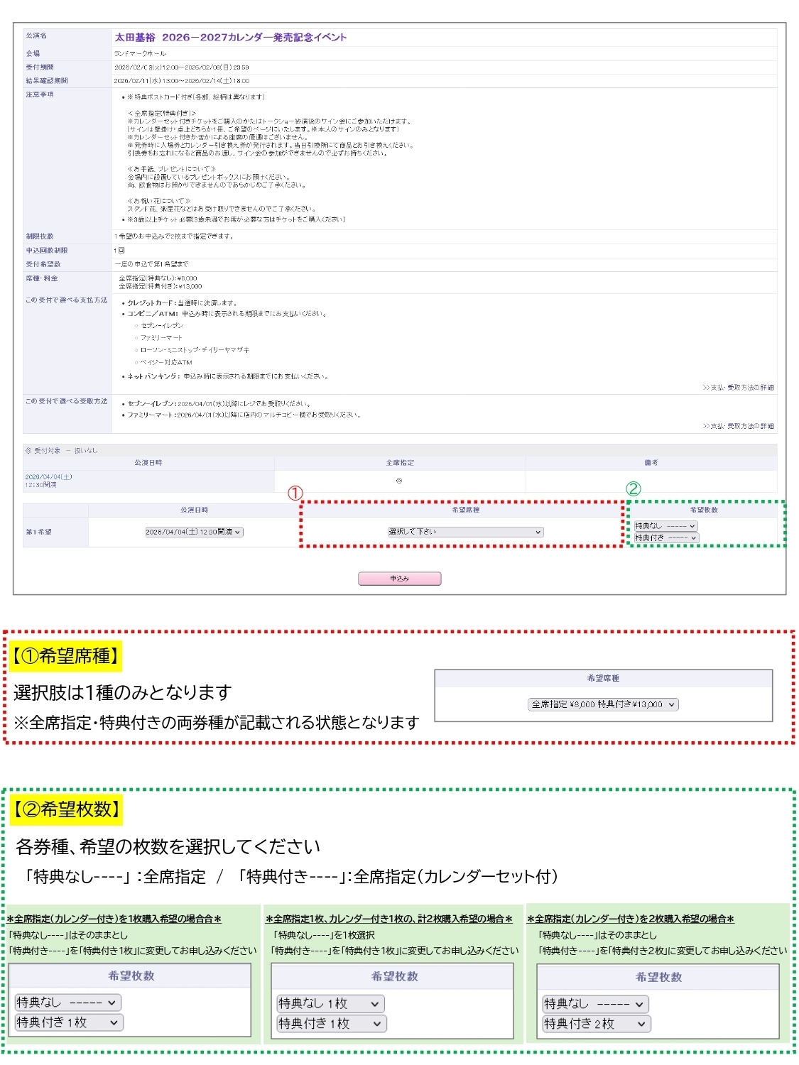 ①画面の「希望席種」部分には「全席指定(特典なし)」と「全席指定・特典付き」の両券種が記載されます。